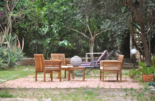 The large garden with Mediterranean plants is equipped with deck chairs, dining table with garden chairs and barbecue, hammock and large shaded area