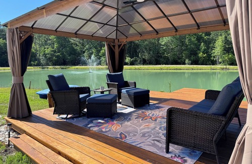 There's a stellar 16' x 16' gazebo with beautiful furniture, a light and ceiling fan, screen and solid panel zipper sides, and a little dock that extends over the pond. Sit and watch the lighted fountain, talk with friends or family, watch the fish and turtles, and breathe in peace and serenity.