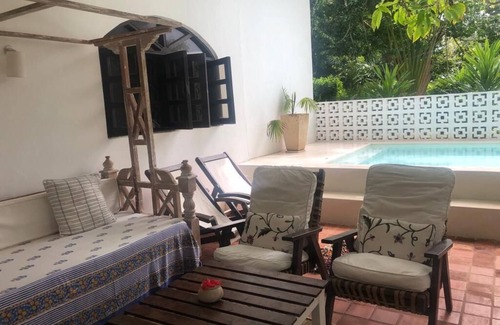 Chikore, meaning a small noisy bird in Kidigo, the local language, is a lovely two-bedroom house with antique arched windows and two bathrooms ensuite. The comfy sitting room has beautiful antique Chinese furniture (a relic of the Indian Ocean trade routes) and original art. The house is very private, being tucked away in the gardens but boasts a lovely big veranda with a small pool where you can splash with small children or sit with a G&T and enjoy the view of the beach. The bedrooms are air conditioned and there are also overhead and stand fans.