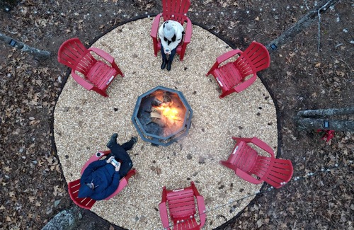 This single-story cabin accommodates 4 guests with 2 bedrooms, 1 sofa bed, a game room, a fireplace, and an outdoor fire pit.