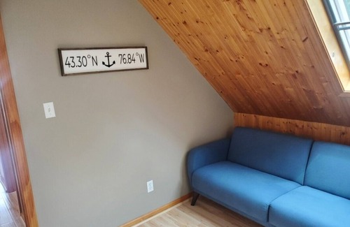 This four-season retreat features views of both Lake Ontario and Port Bay from the two-story deck with a secluded hot tub on the lower level. The upper level includes: A Paris-inspired dining and living area, an open concept kitchen with island and living room with wall to wall windows facing Lake Ontario. The lower level features: A lake-themed living room connected to the lower deck via sliding glass doors, and a spacious lower level master bedroom with adjoining sitting area. All of the rooms described above have seating options that offer reading nooks and/or lake views. This one-acre property is tree-lined on both sides, and fully backs to a wooded area. Located on a private drive, and 1,000 feet from the state boat launch site for Port Bay/Lake Ontario that shares a parking lot with the sandy beach along Lake Ontario. This immediate area is ideal for walking, boating, fishing, and endless solar eclipse footage opportunities. There is a point/look-out 500 feet from the house that offers breathtaking views of the Bluffs and sunsets, or view the sunset from the top deck.