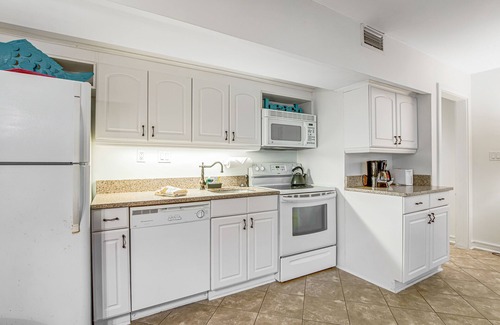 Your first-floor sanctuary boasts abundant natural light thanks to the open living area's wall of windows. Relax in the sunroom alcove and admire the tranquil tree-filled view. The space is elegantly furnished, and the achromatic color scheme creates a simple, clean look. After a fun day in the sunshine, head home, make popcorn in the full kitchen, and unwind in front of the enormous cable TV.