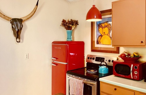 There is a living area with seating for two, suede ottoman-bench, sofa chair, and a HDTV with established Amazon Prime, Netflix and Acorn accounts for streaming TV and movies. Additionally there is a HDMI cord for guests to stream movies or shows from a laptop. Relax and unwind in this quaint setting that includes a writer's desk and a fully-stocked kitchen. Everything you need to create a gourmet meal can be found in the kitchen.