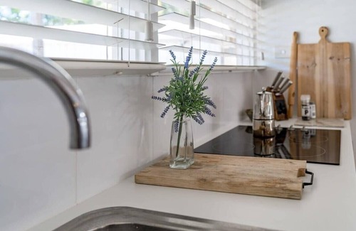 Modern kitchen is well appointed with a dishwasher and coffee machine and overlooks the outdoor entertaining deck.