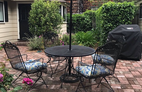 The living room has a sitting/reading area with a skylight and large window overlooking the side patio. There is a wood burning fireplace, cable smart TV, free wifi, a game table, and comfortable seating. The kitchen has an eating area with table and chairs for 4. The eating area looks out on the back patio which has outdoor dining furniture and a propane fire pit. The cottage is 1200 square feet. There is a one car driveway and parking on the street which is just out of reach of the tourist traffic in downtown Carmel. Amenities include washer/dryer, gas stove, microwave, and fully stocked array of pots, pans, dishes, utensils. as well as well stocked array of spices for cooking. Enjoy the back patio and yard with a propane fire pit. The cottage is close to the Carmel Mission (3 blocks south), and Clint Eastwood's Mission Ranch (2 blocks south) for cocktails and/or dinner overlooking the sheep pasture and the ocean beyond.