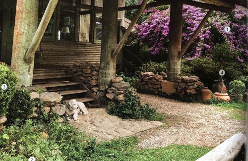 In the master suite, an old bathtub overlooks the woods. The entire house has been decorated with the antique furniture and chandeliers of the family and objects collected throughout life.