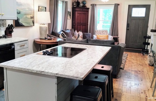 Stay comfortably in Steele at this fabulous, fully renovated 1-bedroom cottage. Open concept living room & kitchen, original pine floors and exposed shiplap walls add to the quaintness of the home. The cozy bedroom features a king bed with new memory foam mattress for a phenomenal night's sleep, armoire clothing storage and smart tv. Enjoy the convenience of WiFi, washer & dryer, large outdoor screened porch/living dining room, fully stocked gourmet kitchen, cozy front porch with southern swing, fully fenced dog yard and more in this home away from home. Lots of special touches and thoughtful extras make this the ideal space for you to stay for weddings, visiting family, outdoor adventures of work assignments. Kickback, relax, and enjoy everything Steele and our cottage has to offer.