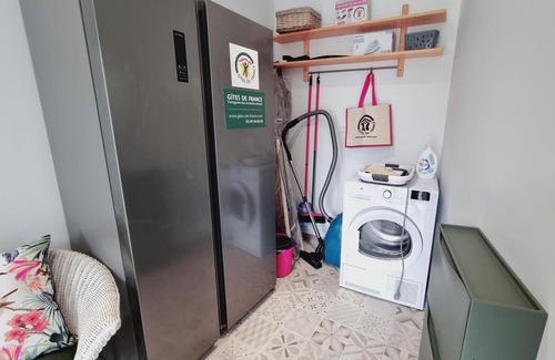 Kitchen equipped with a dishwasher, 3-burner ceramic hob, washing machine, oven, microwave, filter and pod coffee maker.