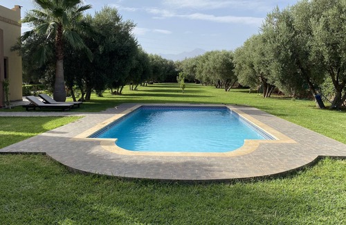 You will stay in a house of 150 m² decorated, with 3 air-conditioned bedrooms, 1 with 2 twin beds, 3 bathrooms, 1 large lounge with TV, dvd, satellite, overlooking the terrace, large kitchen, all on a garden of 4500 m² with its private pool. Permanent surveillance is provided by a couple of guards living in a small house at the entrance of the property and two dogs. Only 25 minutes on the tourist route of Ourika, the center of Marrakech, and 15 minutes from the shopping center Almazar Carrefour, cinema, disco, bowling ...