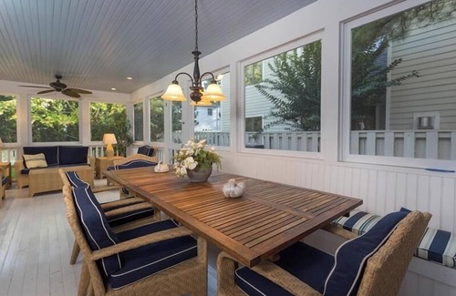 Charming two-story property located 2-1/2 blocks to the beach. This bright and sunny DOG- FRIENDLY home is perfect for multi-generational vacations. The first floor offers a large living room, sunroom with vaulted ceiling and a TV, kitchen, and sleeping den with a twin daybed with trundle (converts to 2 twins) and full bathroom. Four bedrooms are on the second floor: a spacious ensuite bedroom with queen bed, bathroom with double-sinks and oversized tub, walk in shower and TV; three additional bedrooms (one with a queen bed, one with two double beds and one with three twin beds) with a full bathroom in the hall. A doggy door-accessible fenced, landscaped corner lot, an oversized screened back porch with separate eating and sitting areas, front screened porch and upper deck. Comfortable upholstered furnishings, hardwood floors and custom wainscoting throughout make this home warm and cozy. Other features include a separate laundry room, outside shower, enclosed yard with outdoor dining area with gas grill, and many other features. Limited storage permitted in attached garage for bicycles, beach accessories, etc. Complimentary Rehoboth Beach parking passes for use during your stay.