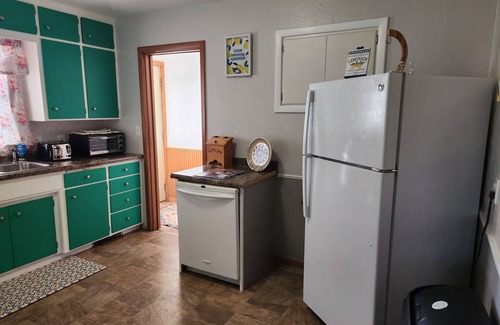 The big kitchen has room to move around while cooking a meal. The kitchen has comes fully stocked with dishes (kid), cups, silverware (kid), utensils, cooking and baking pans. I supply salt, pepper, oil, sugar, oatmeal, and popcorn. This kitchen features a full size fridge, Stove/Oven, Sink, and dishwasher. Cleaning supplies also included under sink.