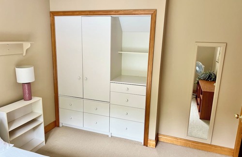 Upstairs you'll find three spacious bedrooms all with new bedding and pillows. The primary bedroom hosts a king size bed and large built-ins. The second bedroom has a queen bed and built-in closet with hangers and plenty of drawers. The third bedroom has a double bed, and same built-in closet. Completing this level is a bathroom with two marble-top vanities, toilet, large walk-in shower and deep standalone bathtub. Shampoo, conditioner, body wash, and brand new towels are provided.