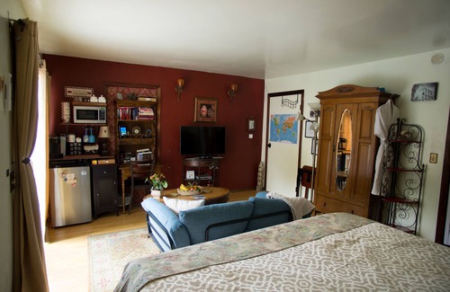 Your 400 square foot suite is separate from the main house and offers you your own private entrance, a private en-suite bathroom w/shower. It includes a basket of complimentary fine toiletries, lush towels and fresh linens. A super comfortable and luxurious King-size bed, a comfy futon/sofa, a table, a coffee/tea/hot chocolate maker, a microwave, a refrigerator, (stocked with complimentary bottled water, soda and juice)Toaster, kettle,cups, plates and silverware, a beautiful writing desk, Cable TV, central air, FREE Wi-Fi, and plenty of FREE street parking right by the house, are all included in your room rate!