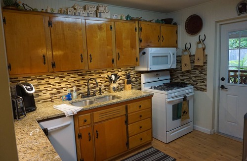 Kitchen is fully equipped with dishes, utensils, and appliances for making home cooked meals with granite countertops and tile backsplash.. Large covered deck in back with gas grill and plenty of seating to relax and enjoy your vacation and time with family.