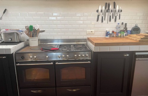 While some settle in front of the big screen to watch the evening match (with full Canal+ access), others are already at home in the open kitchen, equipped like a professional culinary workshop: a range cooker, two ovens, butcher’s block, set of knives, pots, and everything you need to prepare a grand meal together. Dinner promises to be convivial around the majestic square table where everyone easily finds their place.