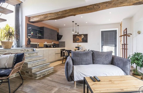 Detached house. Living room (TV, ADSL internet, desk). Kitchenette (oven, induction hob, dishwasher, microwave). Laundry room (washing machine, refrigerator with freezer). Separate toilet. Shower room with walk-in shower. On the 1st floor: bedroom 1 (160x200 bed), bedroom 2 (2 90x190 beds) and bathroom (toilet and vanity unit). Baby equipment on request. Electric heating included. All charges included. Towels provided and sheets for hire. Cleaning service at an additional cost. Accessible on the half-level, private enclosed terrace. Garden furniture. Barbecue. Opposite Jean-Luc and Catherine's house, this old schist stone barn is a charming address for your vacation. Designed in a loft workshop style, the cottage offers a generous living space and a long, east-facing private terrace. This terrace overlooks a natural meadow, not overlooked, and offers a lovely view of the sea! Although it doesn't have a garden, you still benefit from a green and peaceful environment. The swaying of the tall grass in the breeze is soothing. The upstairs bedrooms are separated by a mezzanine landing and share a lovely bathroom. You'll surely fall in love with the large bedroom with its light-filled glass roof. You can walk to Bretteville beach and explore the magnificent surrounding coastal landscapes, dotted with coves, lighthouses, and picturesque hamlets...