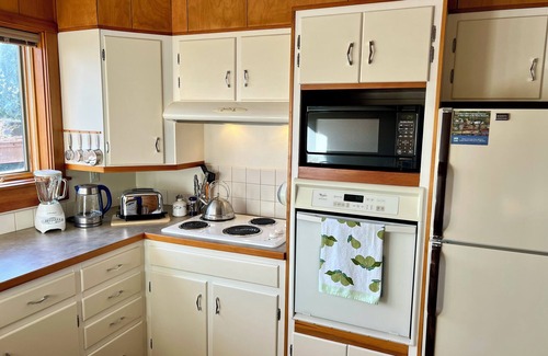 Relax in this peaceful, centrally-located garden level vacation rental just blocks from the Rain Bird Trail, 4 minute drive to airport ferry, 1 mile to downtown Ketchikan shopping area and cruise ship docks. The 2-bedroom, 1-bath lower level duplex apartment features original midcentury built-ins, Heywood Wakefield pieces and watercolors by Ketchikan artist, Dick Miller. Bright and spacious southern-facing living area, dining nook and kitchen feature lovely views of the back garden and patio.