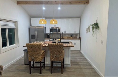 The kitchen is fully equipped with modern appliances and amenities, making meal preparation a breeze. Gather around the dining table to enjoy meals together, with plenty of natural light streaming in from the nearby windows and a beautiful view of the lake.