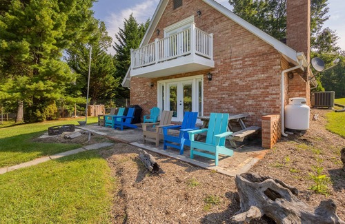 Outside, enjoy direct lake access with a private dock, a fire pit surrounded by chairs for evening gatherings, and multiple decks with seating areas for dining or relaxing. The property offers ample parking and is conveniently located near Claytor Lake, Radford University, and Virginia Tech, making it the perfect getaway for both adventure and relaxation