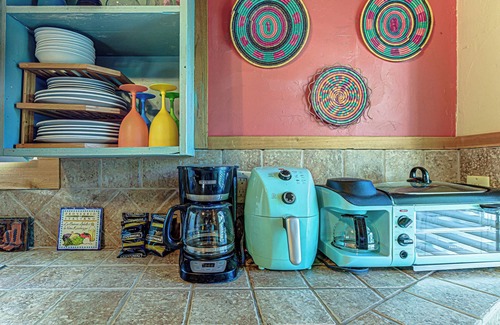 This home sleeps 4 guests between a private bedroom with full size bed and queen size sleeper sofa in the living room. The bedroom also includes a plush full size bed fitted with crisp linens and soft blankets for a great night’s sleep. The home’s guest bathroom includes a pedestal sink and walk-in shower.