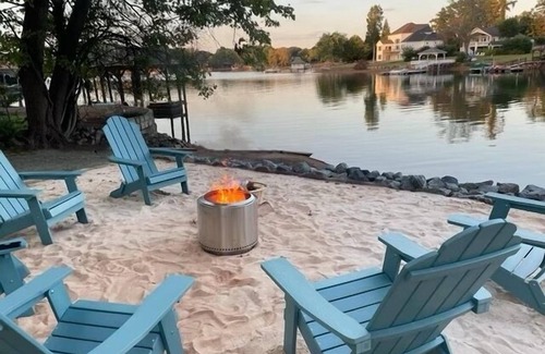 Situated on a peaceful street, this cottage looks out onto a beautiful wide cove. Stretching along the lakefront is a broad patio and beach. The lakefront patio is furnished with dining table and chairs as well as lounge chairs with side tables and multiple rolling umbrellas! The sandy beach area has 8 comfy Adirondack chairs surrounding a large Firepit with a copper lid which doubles as a useful table. A perfect place for an evening gathering after a day in the lake.