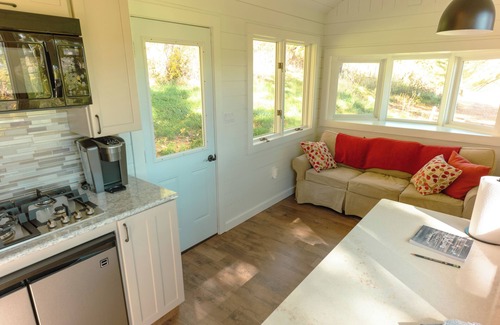 Entering the house you’ll find a narrow hallway giving access to a kitchenette complete with a small fridge and freezer, microwave, stove top, and Keurig. There is a small sitting area looking out over the patio in the kitchenette. A sofa bed sits in this main space for the convenience of additional guests. Up a few steps to the left of the front door is a cozy bedroom with a double bed. The indoor space has lots of windows bringing in natural light and offering the view from indoors.