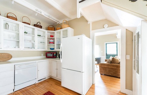 Enter your property via electronic lock, and forget the hassle of carrying keys! Your new home away from home may appear quaint from the outside, but stepping inside you'll be in for a surprise. The tall ceilings make this cozy getaway, feel large and airy. The living space features a sofa, a flatscreen television in a large armoire, and vibrant artwork. Adjacent, you'll find the dining space perfect for a home cooked meal. The shelves are stacked with books galore! Grab a read, and head out to the patio which is covered by large trees and ivy - A serene reading scene.