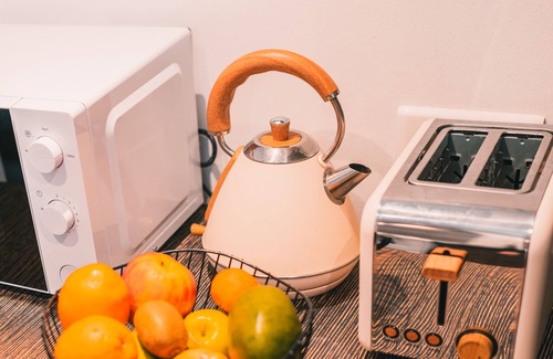 A living room and air conditioning are featured at this 1-bedroom, 1-bathroom rental. Bathroom amenities include a hair dryer and towels. The kitchen is equipped with an oven, a refrigerator, and a dishwasher, as well as a coffee maker, a microwave, and cookware.
