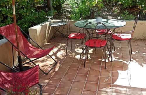 Charming little Mas with a terracotta tiled roof, offering a closed bedroom for two people, an open bedroom area for two people, a lounge area with sofa and TV, an equipped kitchen, a bathroom with shower tiled with colored earthenware. The living room opens onto a 15m2 terrace overlooking the tree-lined garden. of 150m2. All freshly decorated and welcoming. Private parking space in front of the Mazet. Common parking at the entrance of the domain. Swimming pool reserved for the domain of 15m X 5m. Shared laundry room with two washing machines, a dryer, folding beds and baths for children. The area located 3 minutes walk from the village shops is set back from the center, in a street with very low traffic. The private road of the domain only serves access to the 13 mazets.