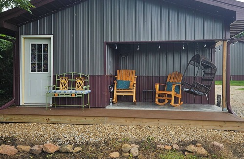 The bedroom space features an ample, comfy queen bed and is adjacent to a living area with a cozy loveseat that folds out into a comfy twin bed -- all made up and organized for a restful night's sleep. Upon waking, you can easily roll out of bed and within a few steps find yourself on the back porch sitting in one of two rustic rocking chairs or a cushioned swing chair, taking in the rolling hills and meadows of native prairie grasses while listening to the morning songs of cardinals, robins, nuthatches, wrens and more!