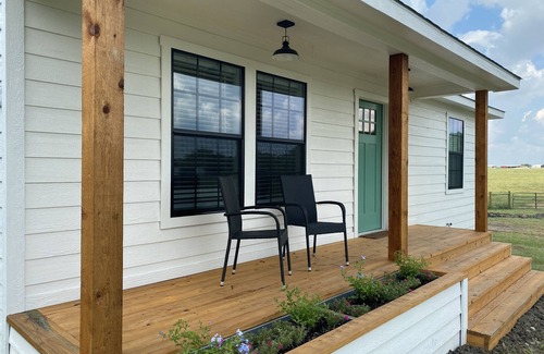 Enjoy glimpses of horses, cattle and sheep when you stay in our beautiful country farmhouse. The 2-bedroom, 1-bath vacation rental features hardwood floors, shiplap, farmhouse decor and a 50-inch Smart TV for relaxing movie nights. Located within 15 minutes of Rockwall, Royse City, Quinlan, and SIX wedding venues, our cozy modern farmhouse is in the perfect location while still giving you a taste of ranch life.