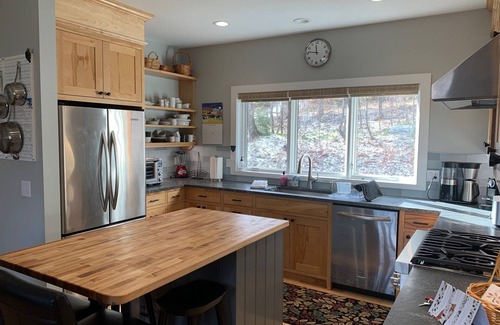 It’s easy to unload from the level driveway into the large mudroom with plenty of space for all your gear. The mudroom opens into a well-stocked gourmet kitchen outfitted with everything you need to prepare meals and eat in.