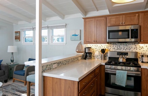 Inside, the great room with vaulted ceilings provides comfortable living with an open, spacious feel. The new kitchen with designer backsplash tile has new cabinets, countertops, stainless steel appliances, garbage disposal, coffeemaker, blender, small appliances and filtered drinking water (sorry, no dishwasher). The single-story open floor plan of kitchen/dining/living space creates an intimate, peaceful atmosphere with plenty of seating and a flat screen TV serviced by cable. The bedroom has a queen bed, new HD Smart TV, and an attached bathroom with walk-in shower. The living room has a queen sleeper sofa with a Tempur-Pedic mattress. Linens, towels and all basic supplies are provided. High speed WiFi is available throughout, and play your favorite playlists with our Bose Bluetooth speaker.