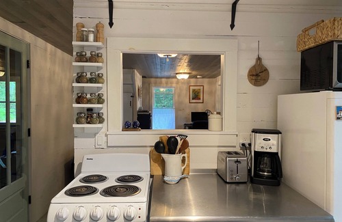 On the 1st floor, there’s a well-equipped kitchen with original pantry and farmhouse sink; a full bathroom with new shower; and a living room with direct access to the large screened-in porch and deck overlooking the lake. The view from the porch is mesmerizing; from your perch among the trees (you'll feel like you're in a treehouse!), you can listen to the loons while you drink your morning coffee, read a book, dine at the country-style table or play board games, and take in the beautiful sunsets in the evening. For chilly mornings, there is a heater in the living room that warms the first floor up in minutes.