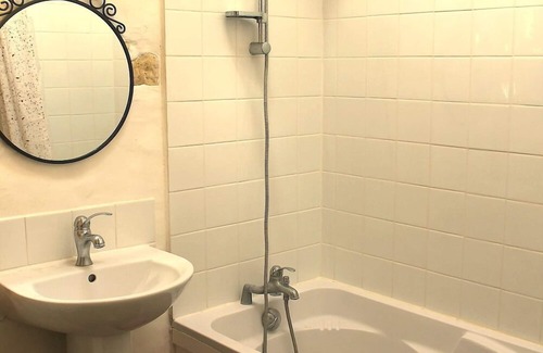 The ground floor bedroom (accessed from the kitchen) can function as a super king size double (160cm) or twin. It is furnished with an ample chest of drawers and hanging rail. The en-suite includes a bath with overhead shower and a heated towel rail.