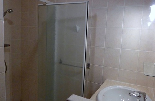 Bathroom with bathtub and shower, separate toilet. Bed sheets and towels included.