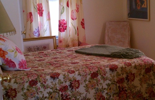 The Coral Cottage, aptly named for its beachy exterior color, sits a stone's throw from the riverbank. The Potomac River, which is 4 miles wide at this location, can be viewed inside through large windows or outside from the front porch or from double chairs at the river's edge. Hardwood floors and tasteful decor throughout the cottage please the eye, enhanced by the natural light from the many windows. There are two sitting areas in the front room -- one with a comfy couch and flat-screen TV for movie viewing and the other with chairs for reading and chatting. The kitchen is open to the front room with a sitting bar between. There is a tall table with two chairs in the kitchen as well. The bathroom with tub/shower and private bedroom can be screened from the front of the house. Through the back door in the kitchen, there is a covered porch.