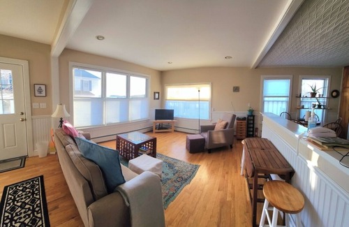 This memorable house is the perfect home base for your trip to Stonington. Two-bedroom, one and a half bath duplex. First floor includes full kitchen w/ dining area, living room w/ comfortable couch, reclining chair and SmartTV. w/cable. Views harbor. 2nd floor has two bedrooms and full bathroom w/tub and shower. Large primary bedroom has a queen bed, closet, and desk with full row of windows for beautiful water views. Second bedroom has a full bed, large closet, dresser and keyboard. Fully stocked w/ sheets, towels, dishes, pots, pans, etc. Parking. WIFI.
