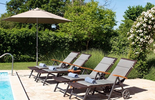 The well-maintained spacious garden with its native plants offers plenty of space to relax. There is a covered and a free terrace in front of the kitchen and a large terrace in front of the pool, which is equipped with 8 loungers. The tiled pool measures 24 m², it has a very comfortable entry through a staircase. Those looking for a shady spot can retire under the kiwi-entwined pergola. Next to it is a large brick barbecue that invites to barbecue evenings. The terraces are laid with natural stone tiles, an old natural stone wall overgrown with ivy separates the garden from the village street. The property is completely fenced.
