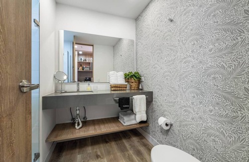 This unit was designed for guests so everything was planned and thought for your stay. The space is beautifully decorated and has a stunning view of the city. Right when you enter you will find a built in kitchen behind sliding mirror doors. This kitchen has a small fridge, cooktop, pots, pans, cooking basics, plates, cups, toaster oven, blender, etc. Next to the kitchen also behind sliding doors in the closet space with iron and ironing board.