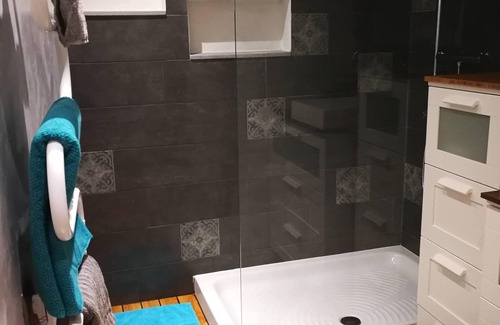 Its independent and luminous entrance gives on the garden. The sleeping part has a comfortable and soft bedding and the living room of table and bench. The American kitchen is spacious and provides all the amenities with halogen hob, large fridge-freezer and large oven. The bathroom has a walk-in shower, a towel dryer and large storage. Towels are provided upon request as well as bedding. The toilets are separated.