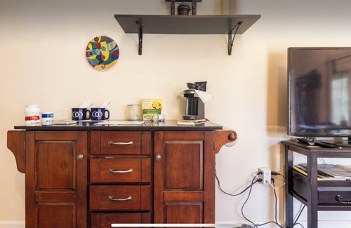 Private bath, queen bed, dining table/chairs, couch, microwave, coffee maker, refrigerator/freezer, tv/firestick.