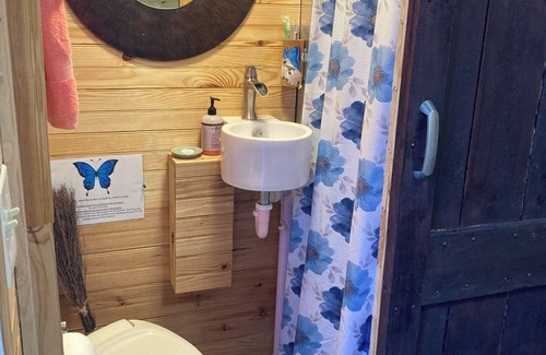 There’s a sleeping loft complete with Japanese tatami mat, and also a day bed on the main level. Your own private entrance, and a simple kitchen space with microwave, mini fridge, and toaster oven. The bathroom includes a shower and space-saving toilet. With a tiny home, space is maximized so this is for people who don’t need a lot to be happy. Wifi provided. Parking is on the street in front of my home. Please, no smokers and no pets.