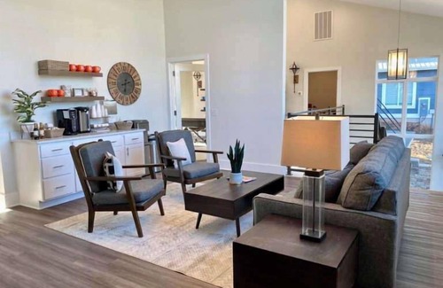 This stunning townhome offers a contemporary, open floor plan designed for modern living. Each spacious bedroom features a private bathroom and walk-in closet, ensuring both comfort and privacy. The kitchen is outfitted with stainless steel appliances, including a refrigerator, oven/stove, microwave, toaster, and a Keurig coffee maker for your morning brew. The living room, with its couch and coffee table, is perfect for relaxing or entertaining. Enjoy complimentary Wi-Fi and modern fixtures, along with a washer and dryer, all wrapped in eclectic design touches that blend style and functionality.