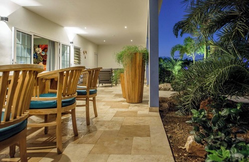 The porch opens up to the garden, which is lit in the evening and features a variety of plants and trees. The garden is designed to maximize privacy, providing the perfect Curaçao atmosphere.