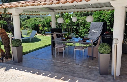 Villa 95 m2 with landscaped garden: yuccas, olive trees, lavenders, Mediterranean essences ... terrace 130 m2, 2 pool houses with furniture: cushions, table and chairs, 4 sun loungers, swimming pool with perimeter alarm. Located in the St Anne district, in a dominant position, between the center of St Tropez (900m) and the beaches of Pampelonne (3kms) Tahiti beach (2kms). Very nice open view. 2 bedrooms, one with 180 cm bed and 125 cm flat screen located on the 1st floor (see staircase photo), and one on the ground floor with 2 single beds which can be pushed together to make only one of 160, with flat screen. Living room 30 m2 with sofa bed 140 and flat screen 125 cm. Fitted and equipped kitchen: American fridge, oven, microwave, dishwasher. Marble bathroom with bath, bidet, double sink. Independent bathroom. Air conditioner. Possibility to go to town on foot. Parking with presence detector. Portal with digital code. Night lighting of the garden and the swimming pool. Gas plancha .: Wifii. Sheets and towels provided. Capacity 4 people.