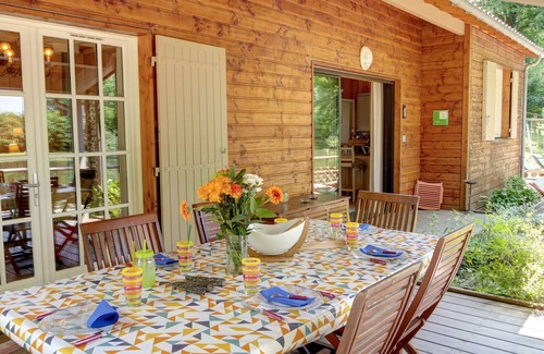 This chalet, entirely built in wood both inside and outside and labelled “Gîte de France 4 épis”, is nestled in a green setting by a private pond.