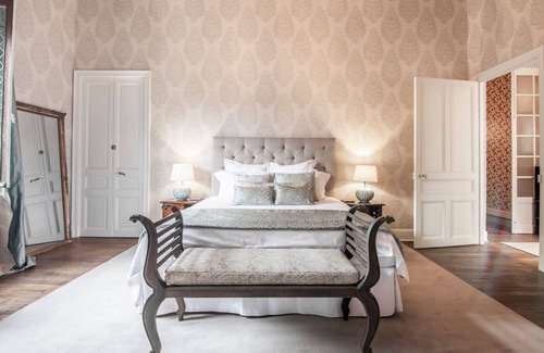 1) 12-person price = 5 bedrooms (1-5)2) 16-person price = 6 bedrooms (1-6)Château InteriorsGround Floor- Living room with doors leading to terrace- Second living area- Library/study with door leading to terrace- Gym/massage room- Orangerie with dining table and doors leading to terrace- Fully-equipped kitchen & Butler's pantry with washing machine and refrigerators.Lower Ground Floor- Entrance (from the village street)First Floor- Bedroom One: Master bedroom with super king-size bed and bathroom with walk-in shower and separate WC. Door from the bathroom leading to a terrace- Bedroom Two: Double bedroom with super king-size double/twin bed and en suite bathroom with shower, small bath and WC- Bedroom Three: Double bedroom with super king-size double/twin bed and en suite bathroom with shower, bath and WC- Bedroom Four: Double bedroom with super king-size bed and bathroom with walk-in shower and WC. The bathroom accessed by hallway that can be closed by doors (not accessed directly from bedroom)Separate Wing (accessed via three steps from the entrance hallway to Bedroom Four, or can be via a separate staircase from the main entrance)- Bedroom Five: Family suite with small double bedroom with queen bed and bedroom with with double bed and sitting area. En suite bathroom with shower and WC