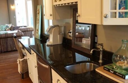 There is an elevator to access all three floors, so you can easily unload groceries from your car to the kitchen, and your luggage straight into your bedroom suite. On the second floor of the home, which serves as the main living area, you'll find a two-story living room with 35-foot ceilings and three sets of French doors that lead out to a covered patio overlooking the cove. The patio rocking chairs offer guests a relaxing spot for watching the boats go by rain or shine, and a large outdoor table for dining day and night. A large flat screen TV, a kids reading nook with beanbags, and a custom-designed powder room with a glass shower is also located on the main floor.