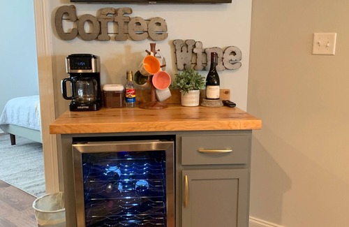 We have a downstairs king master, upstairs king master and a third bedroom with two full beds. All bedrooms have private baths. Hardwood floors throughout. Fully stocked kitchen, wine fridge, kitchen table with seating for 6 plus 3 bar stools at the island. Full size washer and dryer.